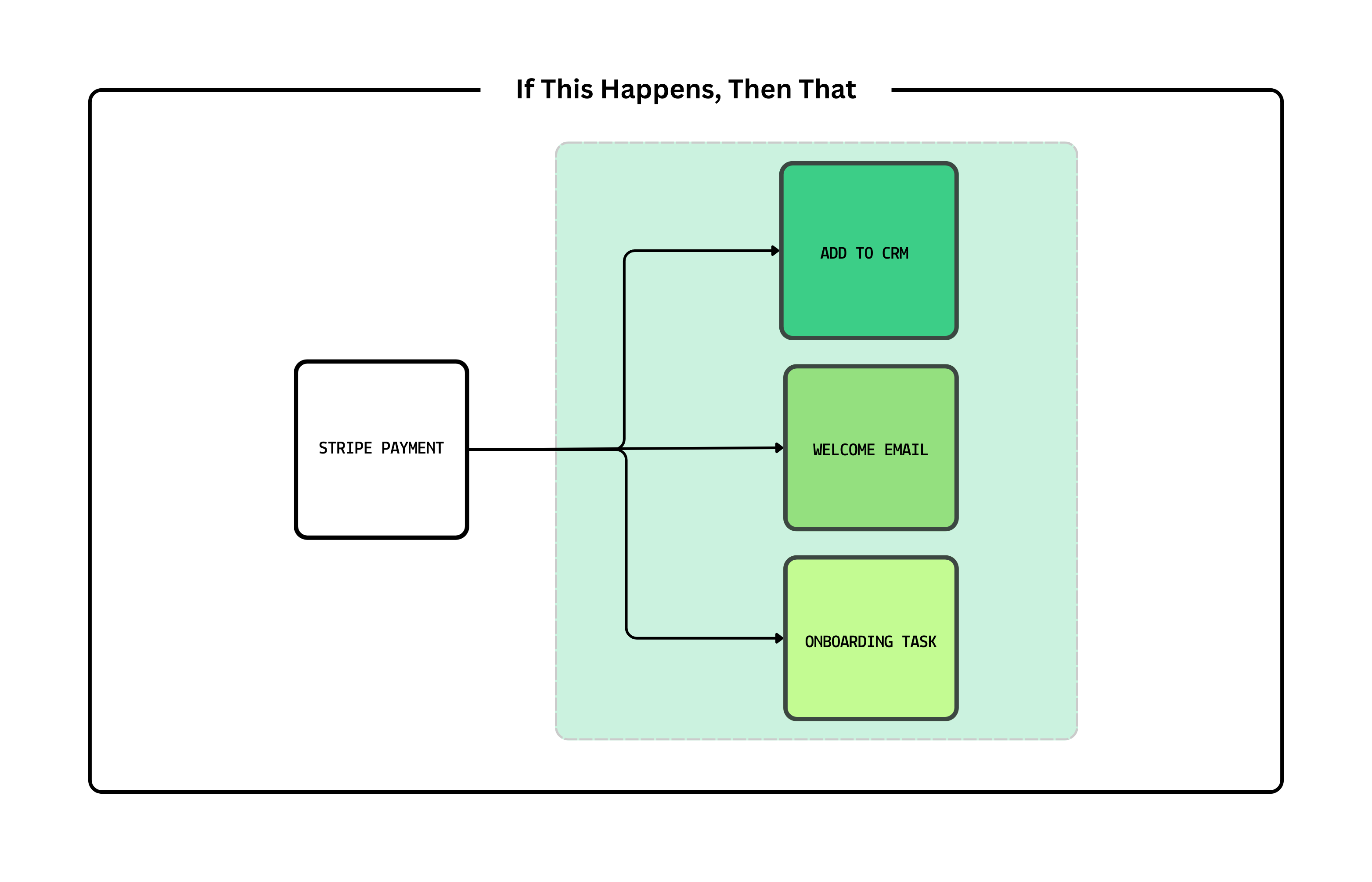 IF new payment in Stripe → THEN add customer to CRM → THEN send welcome email → THEN create onboarding task in Asana.